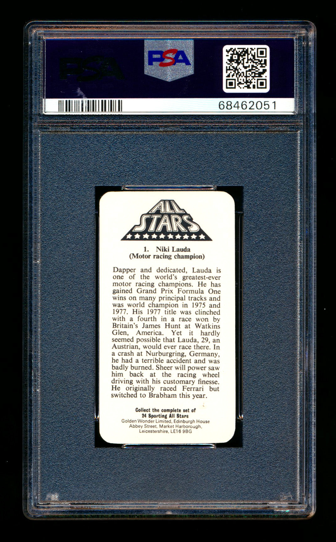1979 Golden Wonder F1 #1 Niki Lauda Sporting All-Stars PSA 10 ** (SOLD Fanatics Fest - $70.00 - 6/20/2025) **