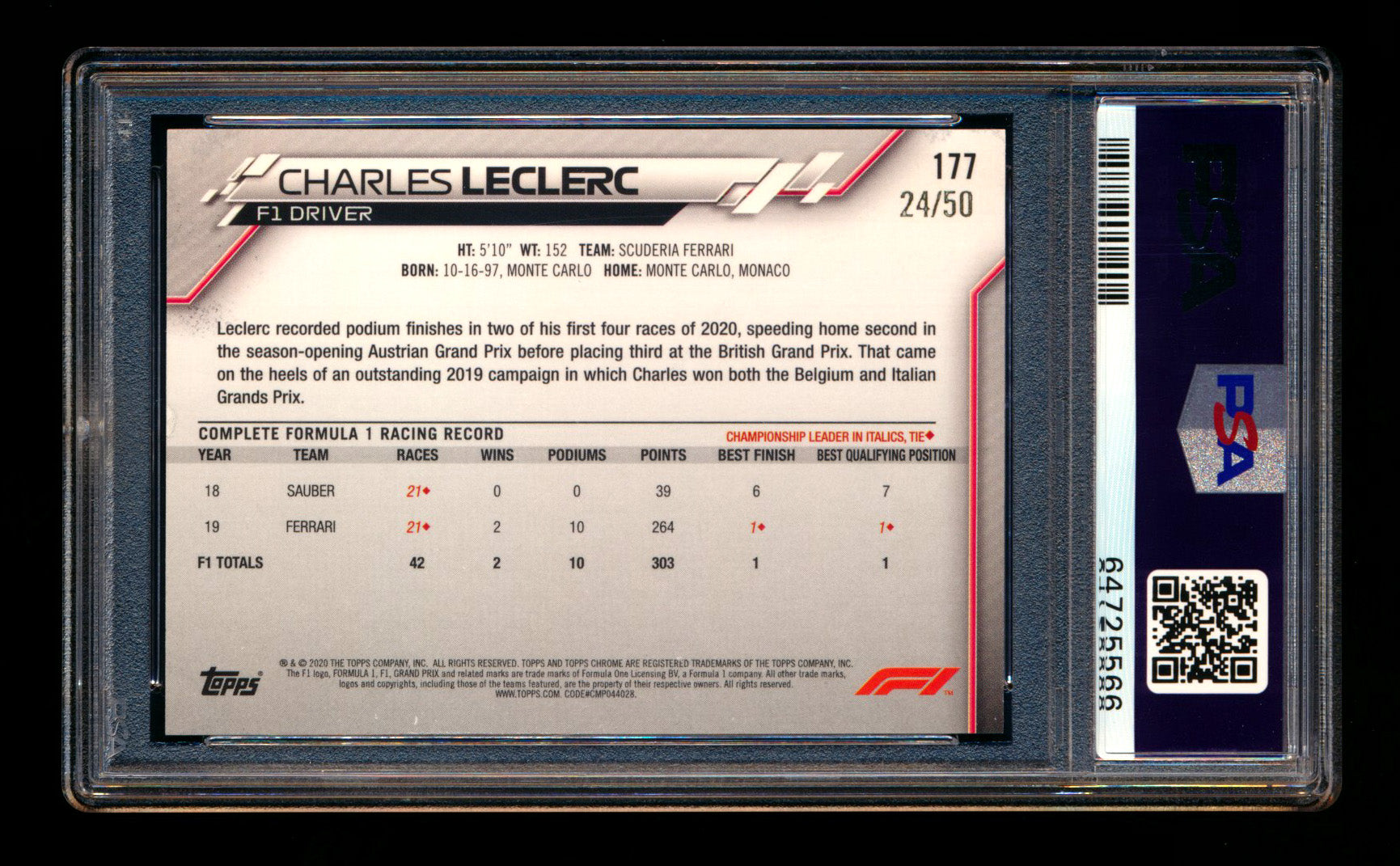 2020 Topps Chrome F1 #177 Charles Leclerc RC Gold Refractor #24/50 PSA 8 ** (SOLD - $249.00 - 2/19/2026) **