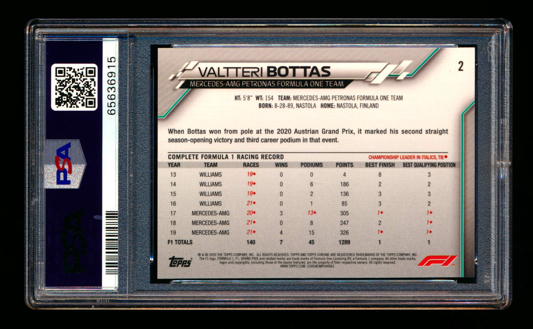 Description: 67 Podiums, 20 Pole Positions, 19 Fastest Laps, 10 Wins, 5 Constructor's Championships and in 2020 Valtteri Bottas finally received his first Topps Chrome Trading Card with this Portrait Card.