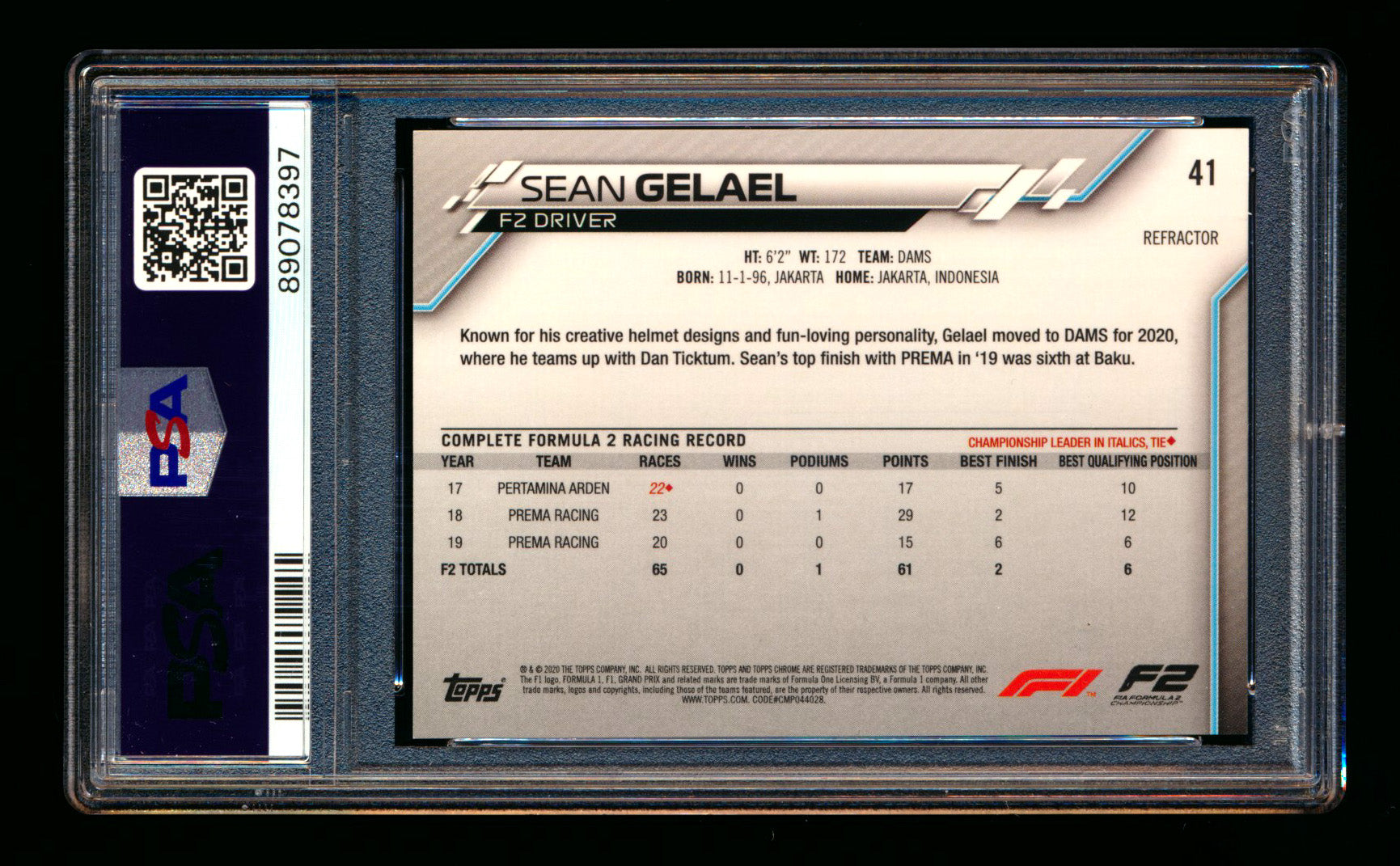 2020 Topps Chrome F1 #41 Sean Gelael RC Refractor PSA 9