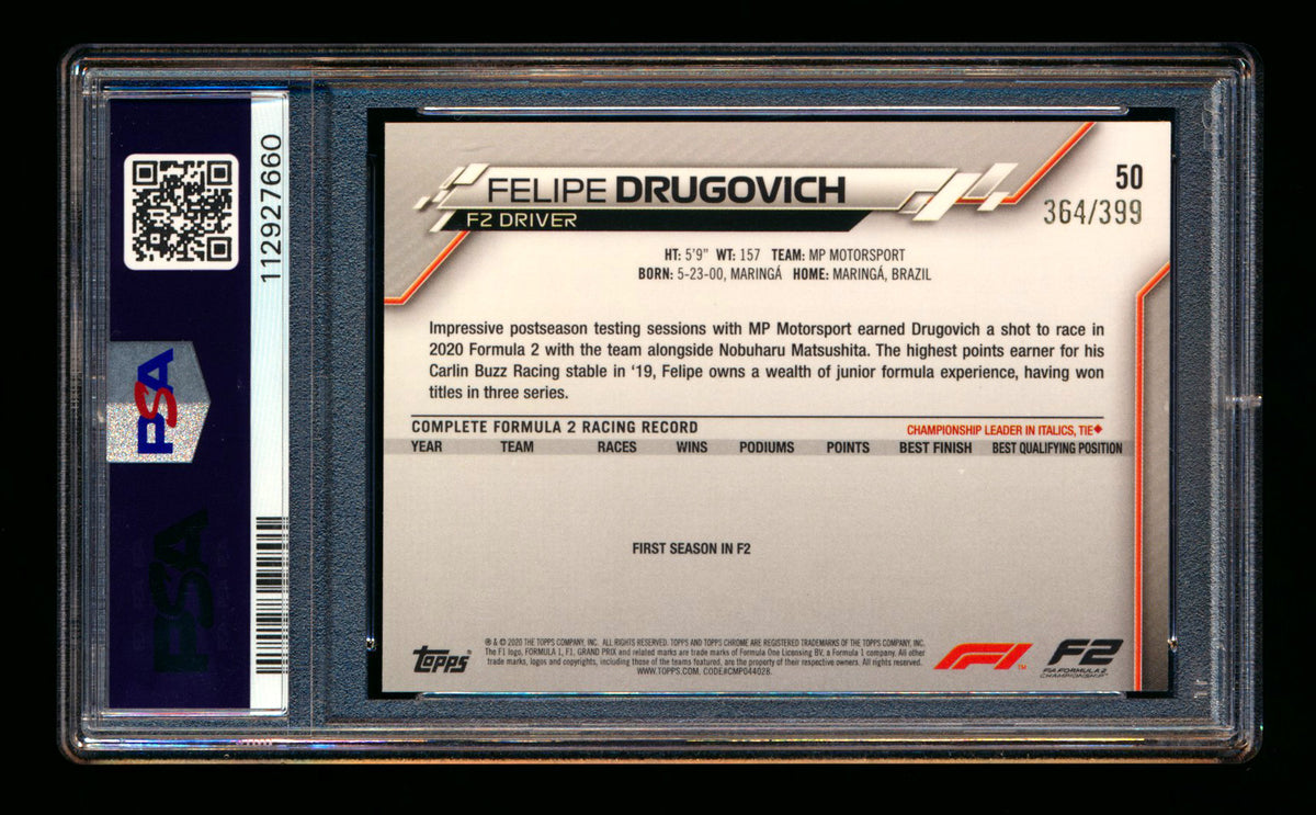 2020 Topps Chrome F1 #50 Felipe Drugovich RC Purple Refractor 364/399 PSA 9
