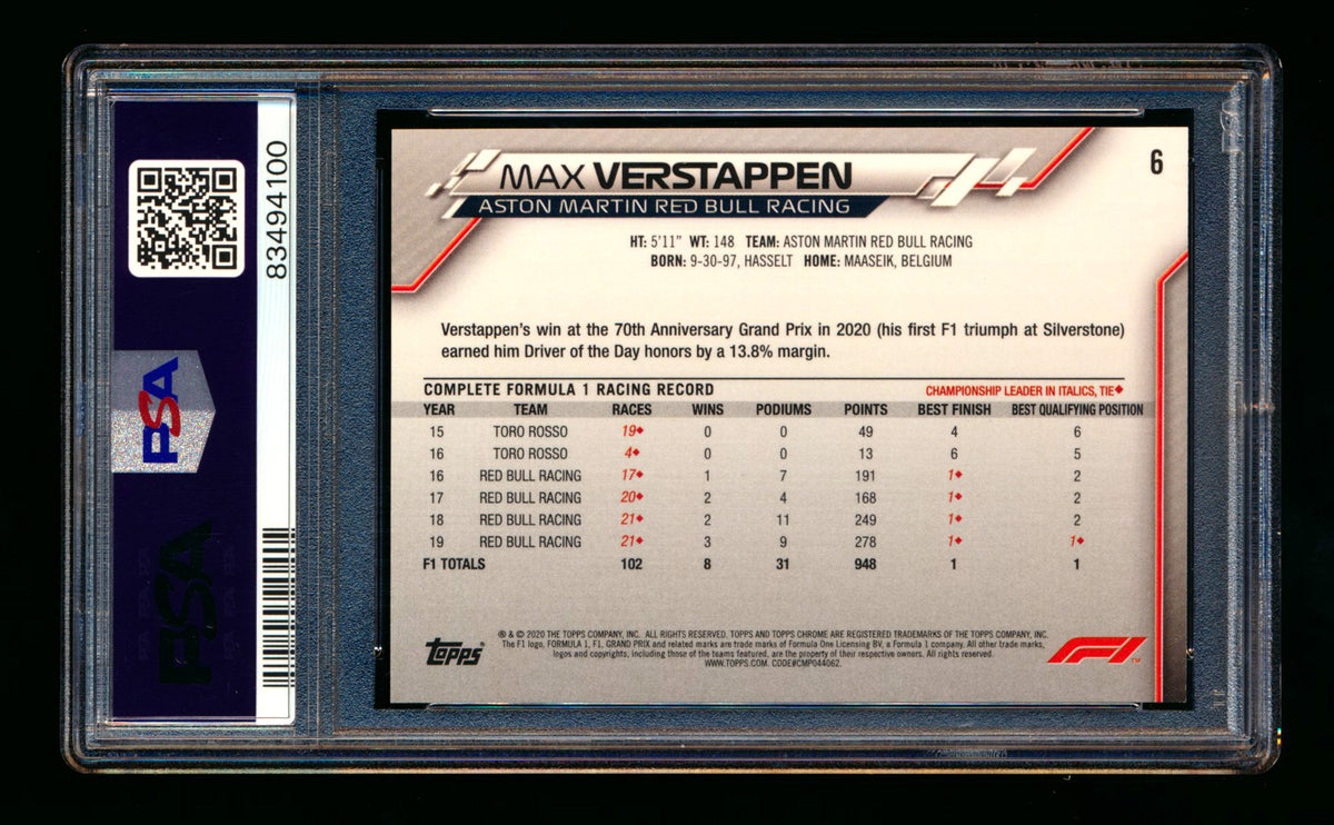 2020 Topps Chrome F1 #6 Max Verstappen RC Refractor Image Variation SP PSA 10 ** (SOLD eBay - $4750.00 - 4/17/2025) **