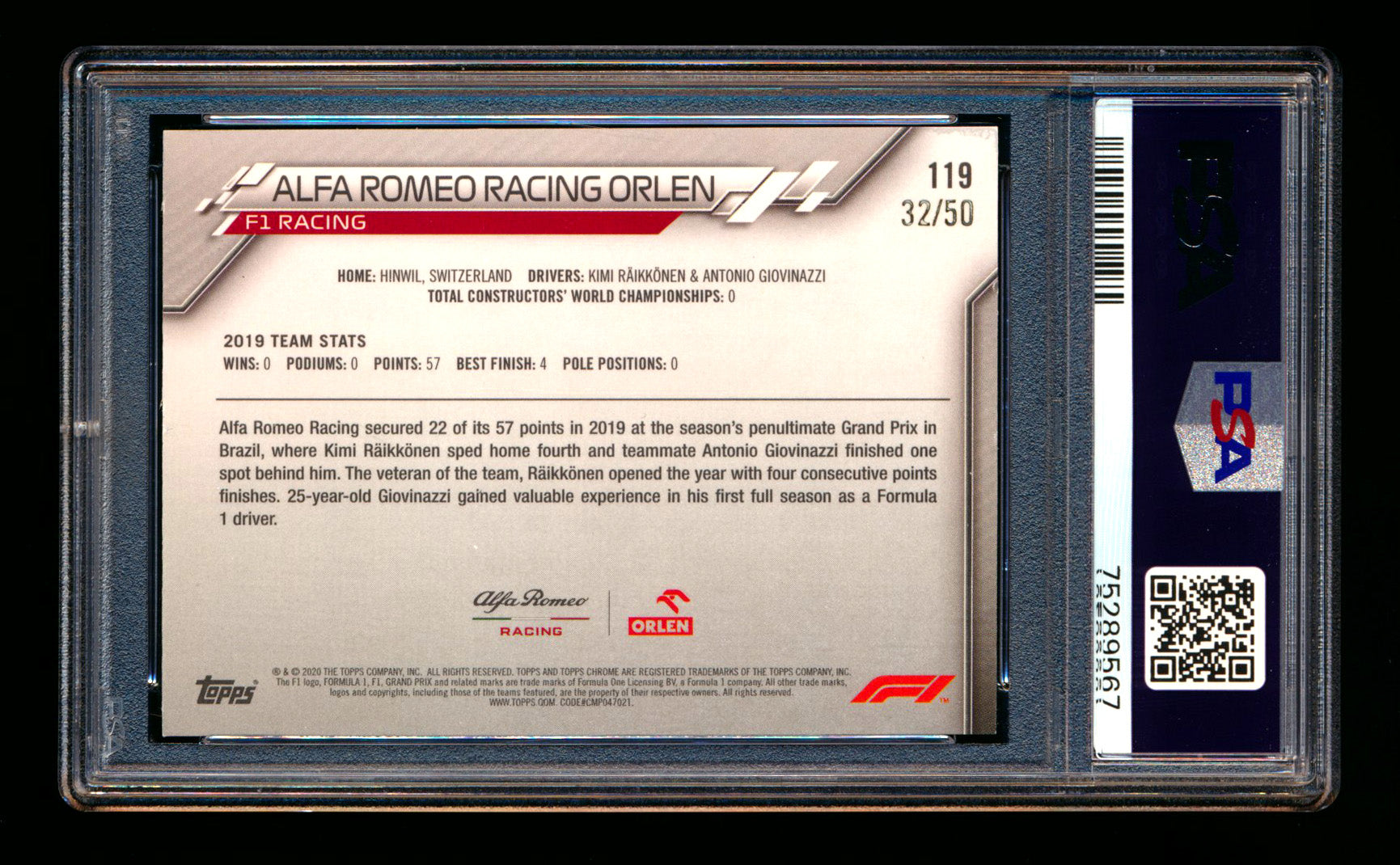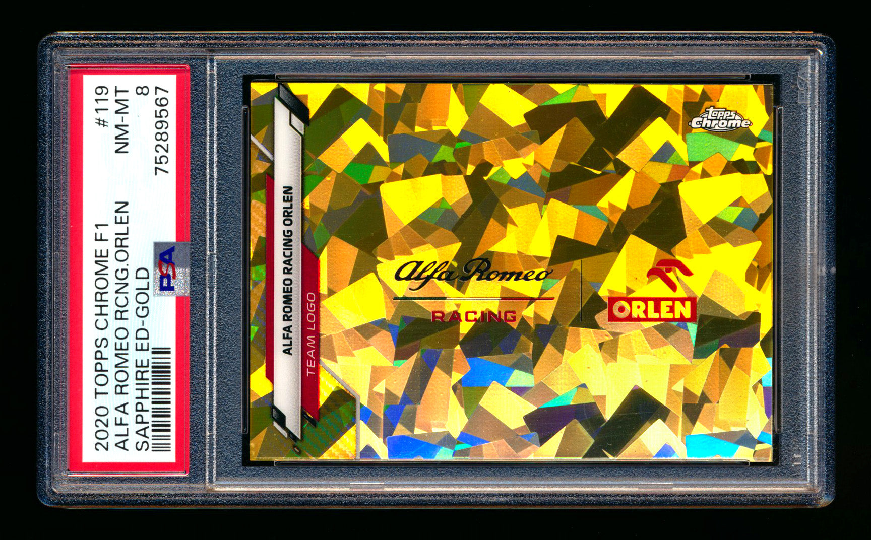2020 Topps Chrome Sapphire F1 #119 Alfa Romeo Racing Orlen Team Logo RC Gold Refractor #32/50 PSA 8 ** (SOLD Nationals - $100.00 - 8/1/2025) **