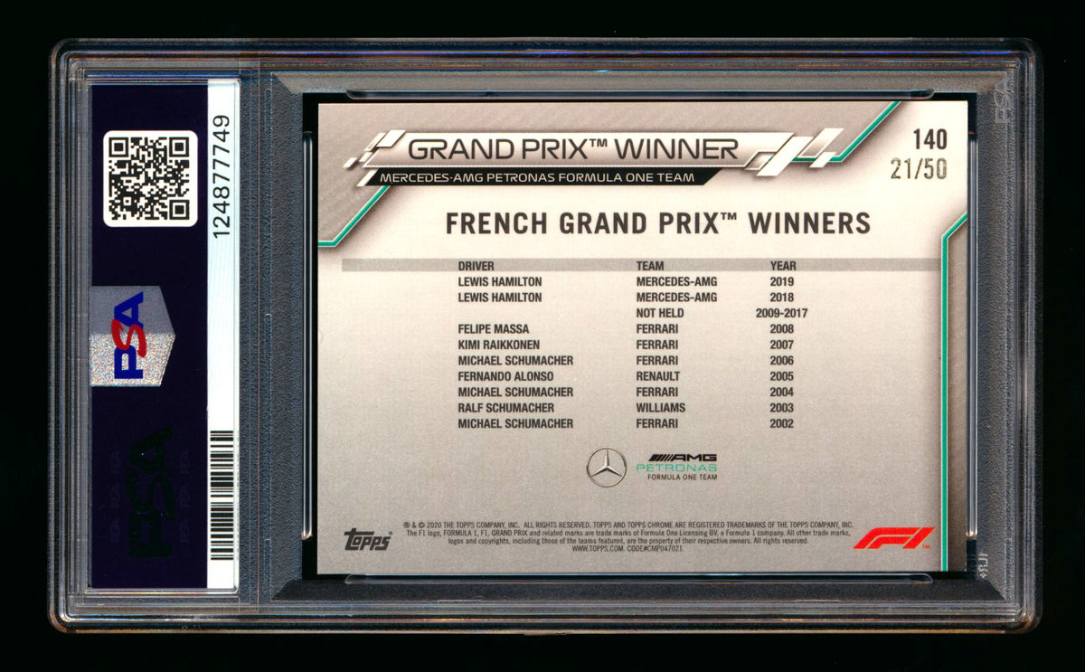 Description: The 79th Career F1 Victory in his illustrious career, Lewis Hamilton would win Pole Position and absolutely dominate the field for his 2nd Win ever at a French Grand Prix. A beautiful moment captured here on the first ever Topps Chrome French Grand Prix card made.
