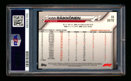 From humble beginnings to World Champion and fan favorite, the back of Raikkonen's 1st Topps card captures it all, including his 21 Career Victories and 103 Podiums. A gorgeous card that no F1 World Champion collection would be complete without.