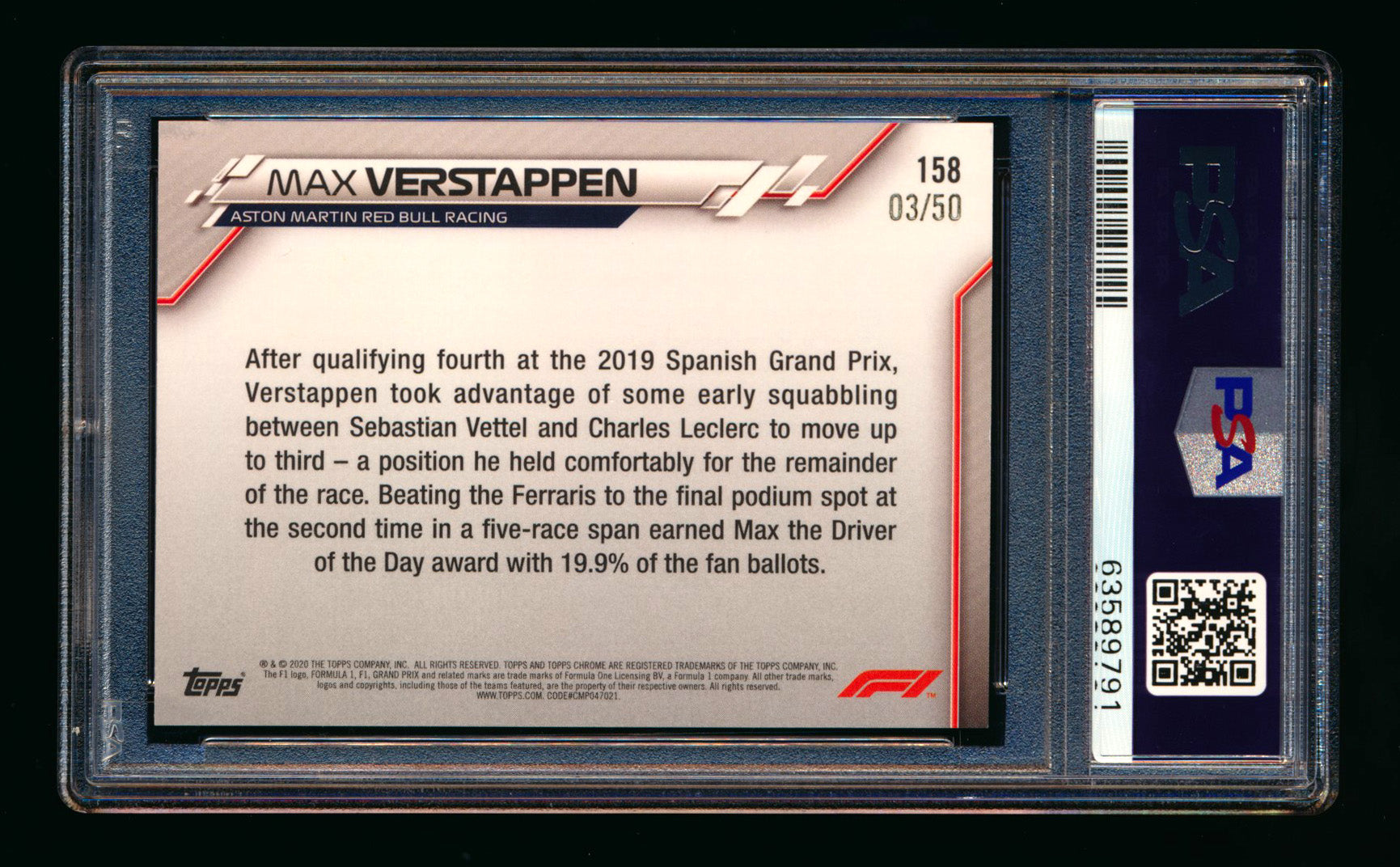 A legendary moment for the legend that is Max Verstappen. Unfortunately there were no F1 Trading Cards being made at the time to commemorate the precocious moment. Luckily though, when Verstappen made his Topps trading card debut in 2020 he was captured here as the 2019 Spanish Grand Prix Driver of the day on his 1st ever Spanish Grand Prix Trading Card Made. The winner of the last 3 Spanish Grand Prixes in 2022-2024, Verstappen is now just 2 away from tying fellow F1 Legends Michael Schumacher & Lewis Hamilton for most wins at the historic Barcelona race.