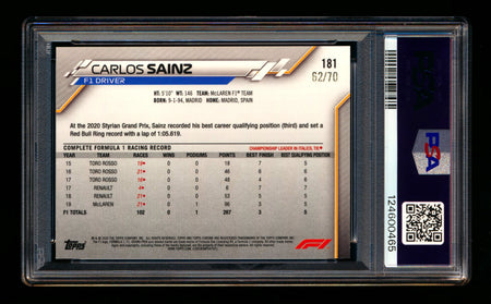 2020 Topps Chrome Sapphire F1 #181 Carlos Sainz RC 70th Silver Refractor #62/70 PSA 9