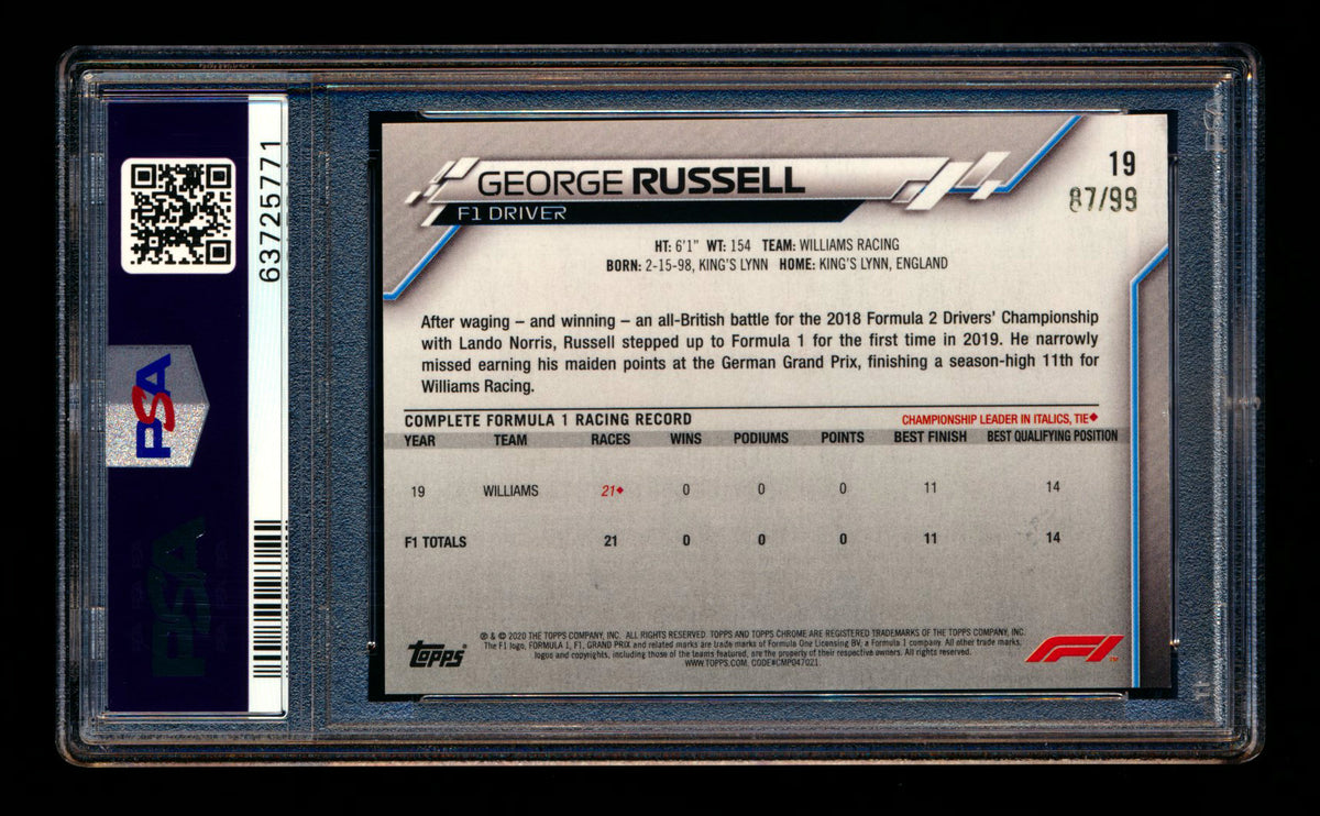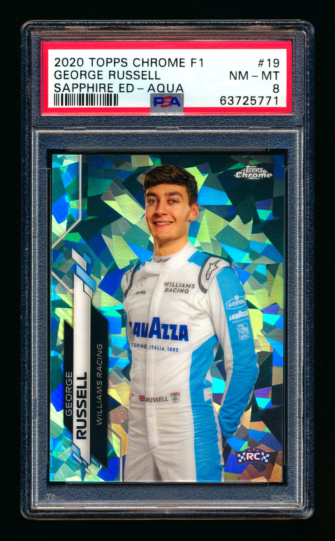 2020 Topps Chrome Sapphire F1 #19 George Russell RC Aqua Refractor Portrait #87/99 PSA 8