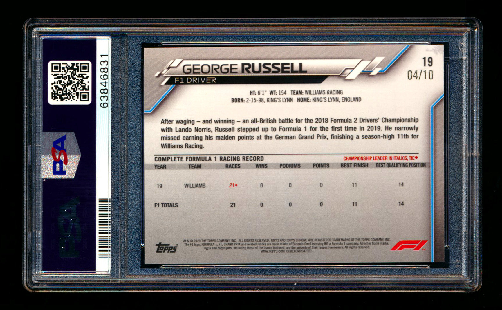 2020 Topps Chrome Sapphire F1 #19 George Russell RC Purple Refractor Portrait #04/10 PSA 10 - POP 1! ** (SOLD Fanatics Fest - Private Offer - 6/21/2025) **