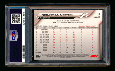 2020 Topps Chrome Sapphire F1 #3 Sebastian Vettel RC 70th Silver Refractor Portrait #67/70 PSA 8
