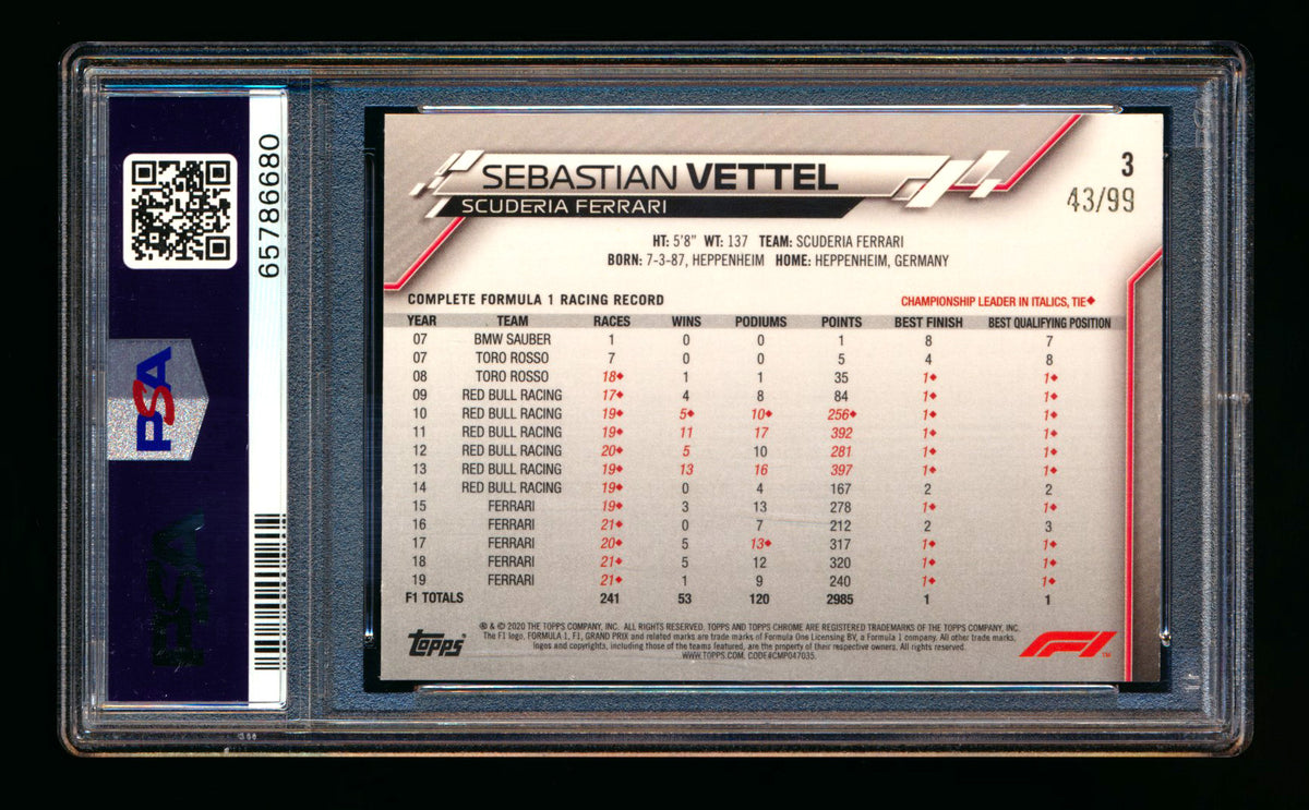 2020 Topps Chrome Sapphire F1 #3 Sebastian Vettel RC Aqua Refractor Image Variation SP #43/99 PSA 8