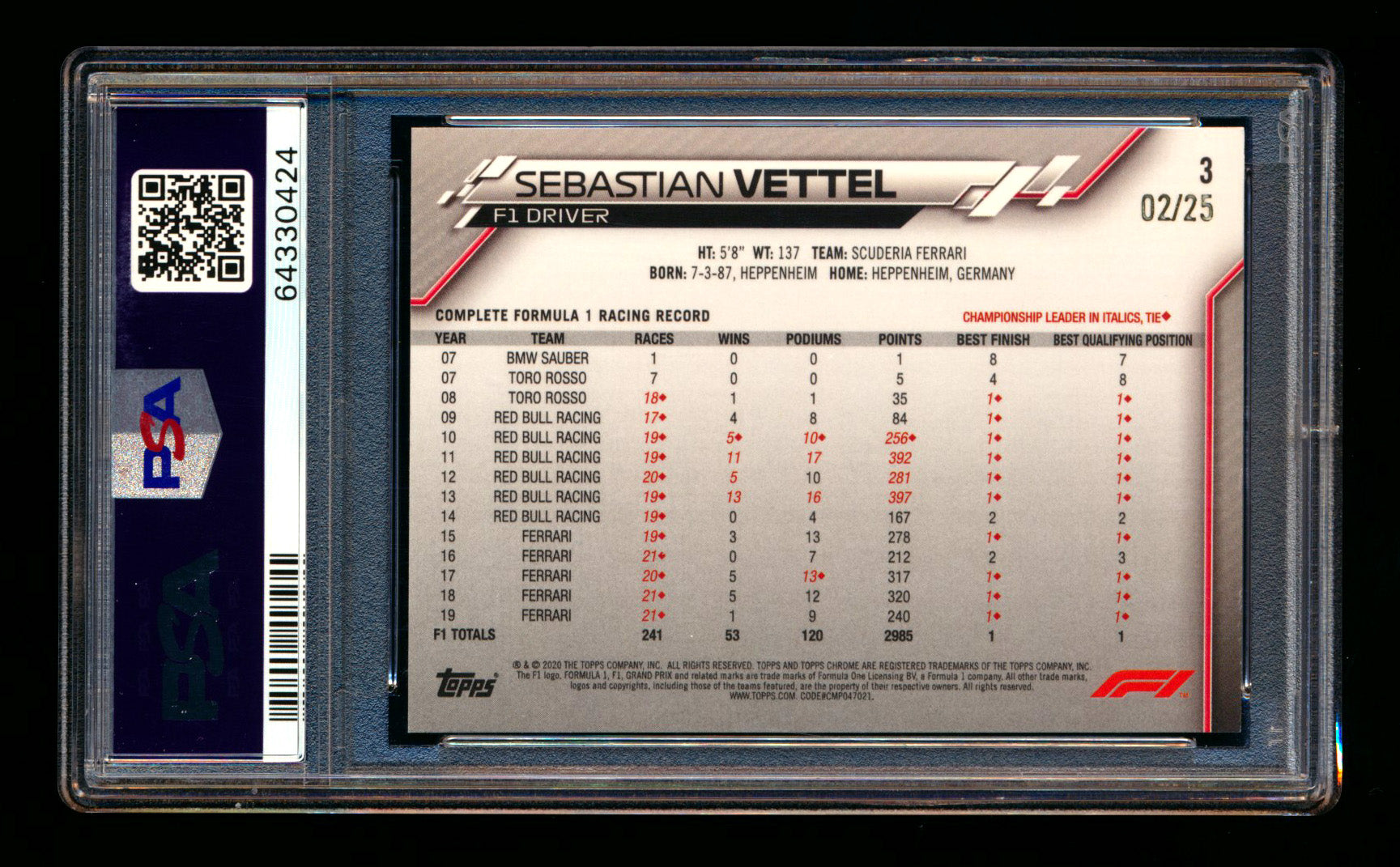 2020 Topps Chrome Sapphire F1 #3 Sebastian Vettel RC Orange Refractor Portrait #02/25 PSA 9 ** (SOLD eBay - $700.00 - 9/20/2025) **