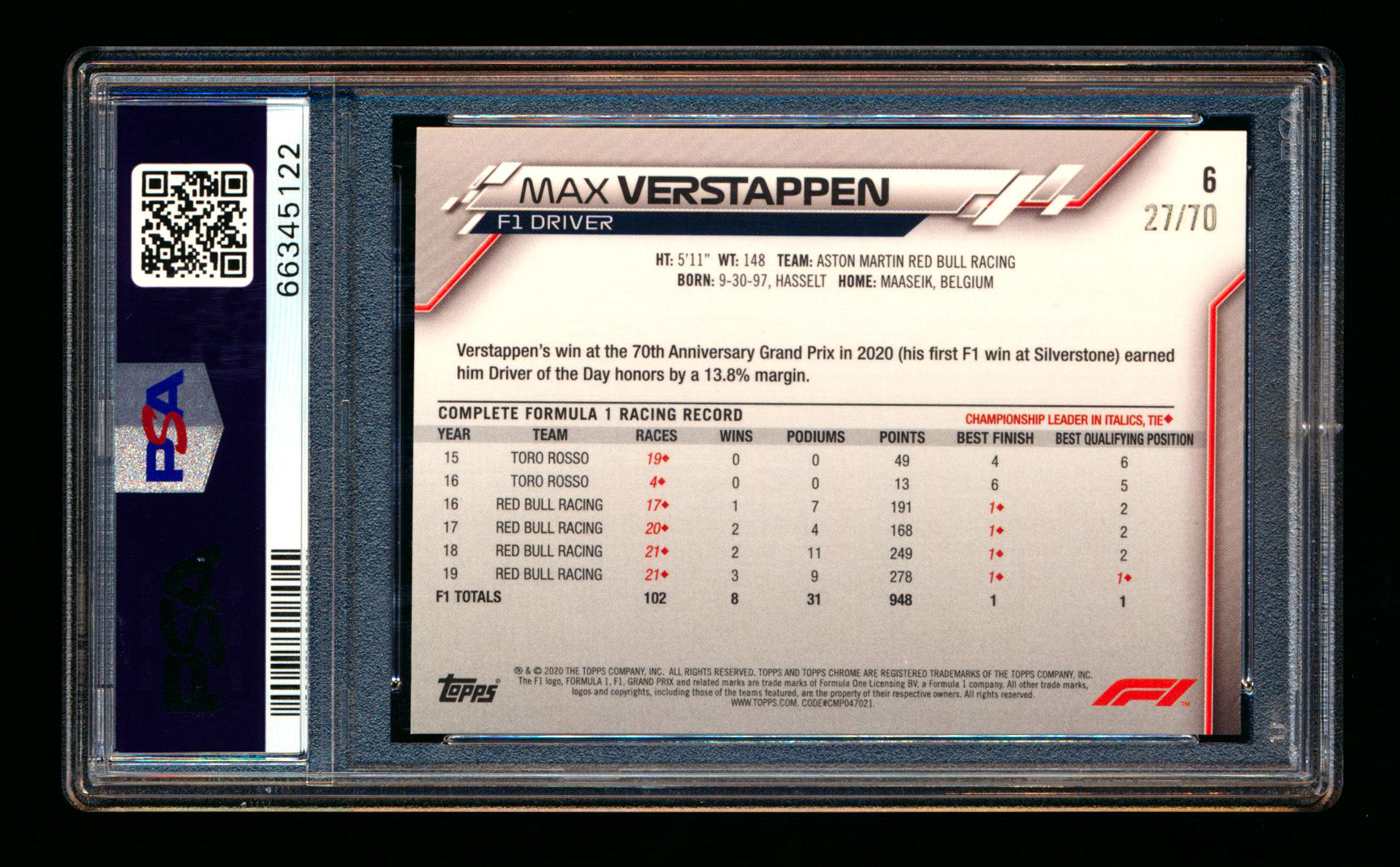 2020 Topps Chrome Sapphire F1 #6 Max Verstappen RC 70th Silver Refractor Portrait #27/70 PSA 10 ** (SOLD Nationals - $3,900.00 - 7/31/2025) **