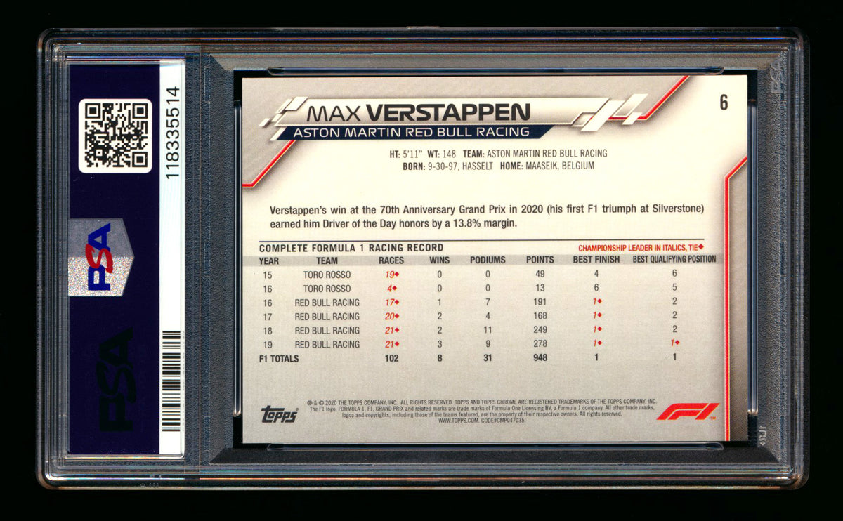 2020 Topps Chrome Sapphire F1 #6 Max Verstappen RC Refractor Image Variation SP PSA 10