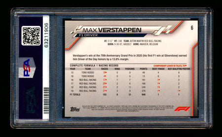 2020 Topps Chrome Sapphire F1 #6 Max Verstappen RC Refractor Portrait PSA 10 ** (SOLD eBay - $349.00 - 9/11/2025) **