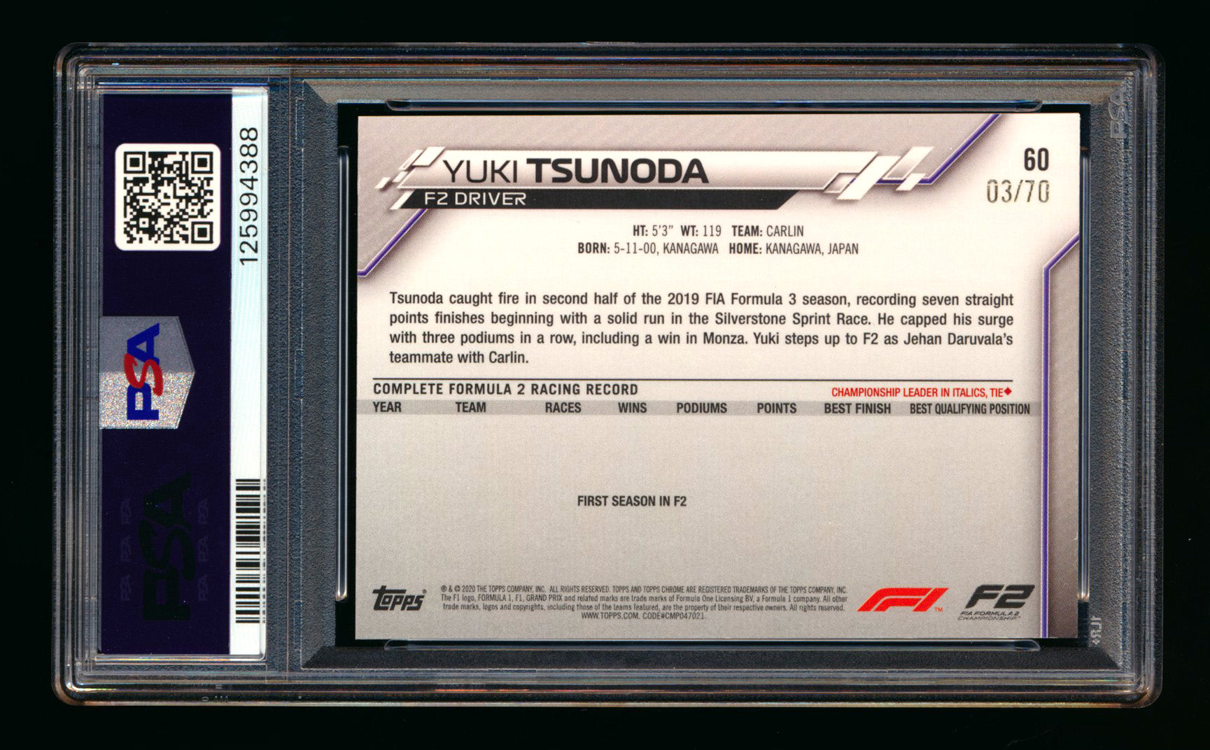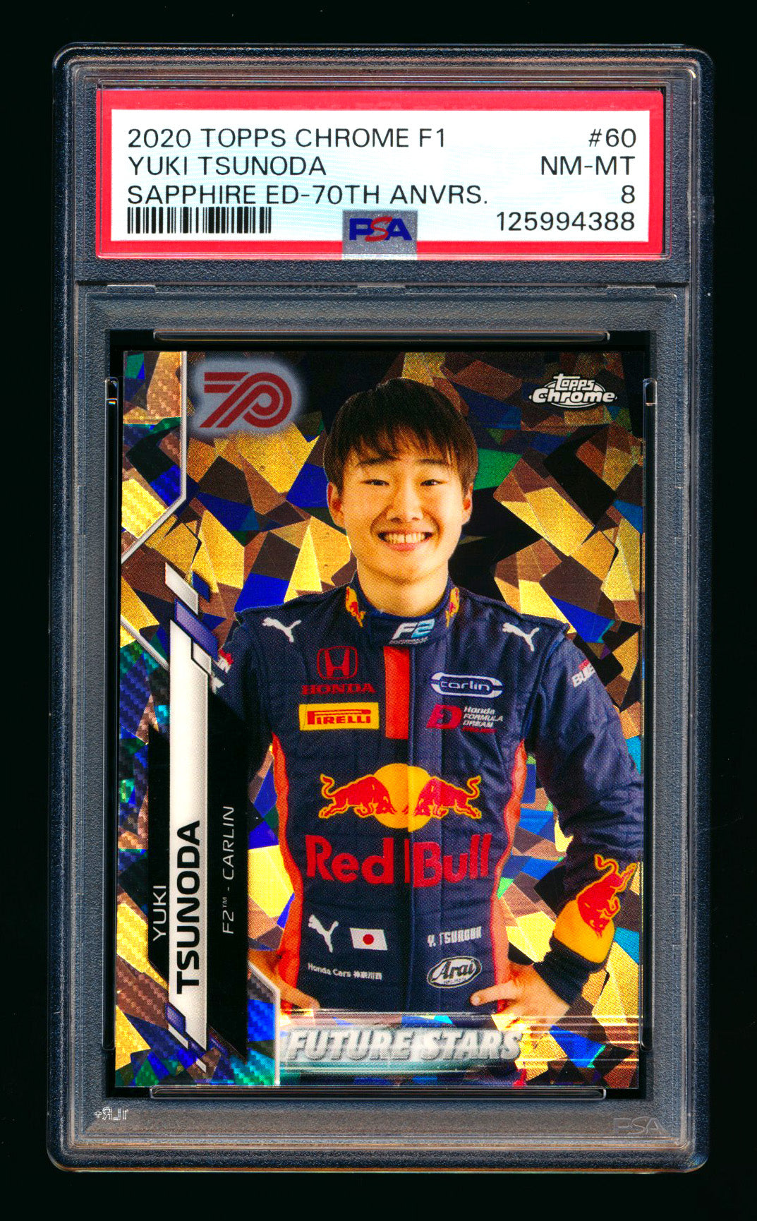 2020 Topps Chrome Sapphire F1 #60 Yuki Tsunoda RC 70th Silver Refractor #03/70 PSA 8