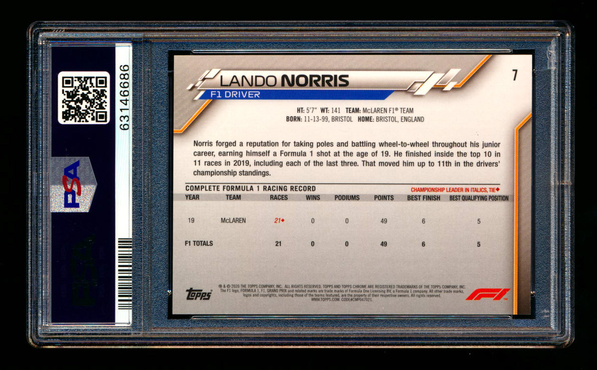 2020 Topps Chrome Sapphire F1 #7 Lando Norris RC Refractor Portrait PSA 10