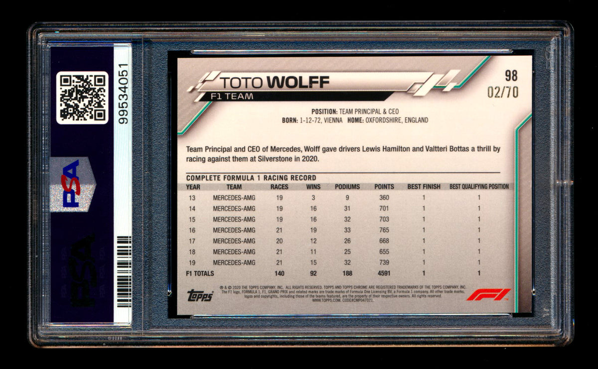 2020 Topps Chrome Sapphire F1 #98 Toto Wolff RC 70th Silver Refractor #02/70 PSA 9 ** (SOLD Nationals - $60.00 - 8/3/2025) **