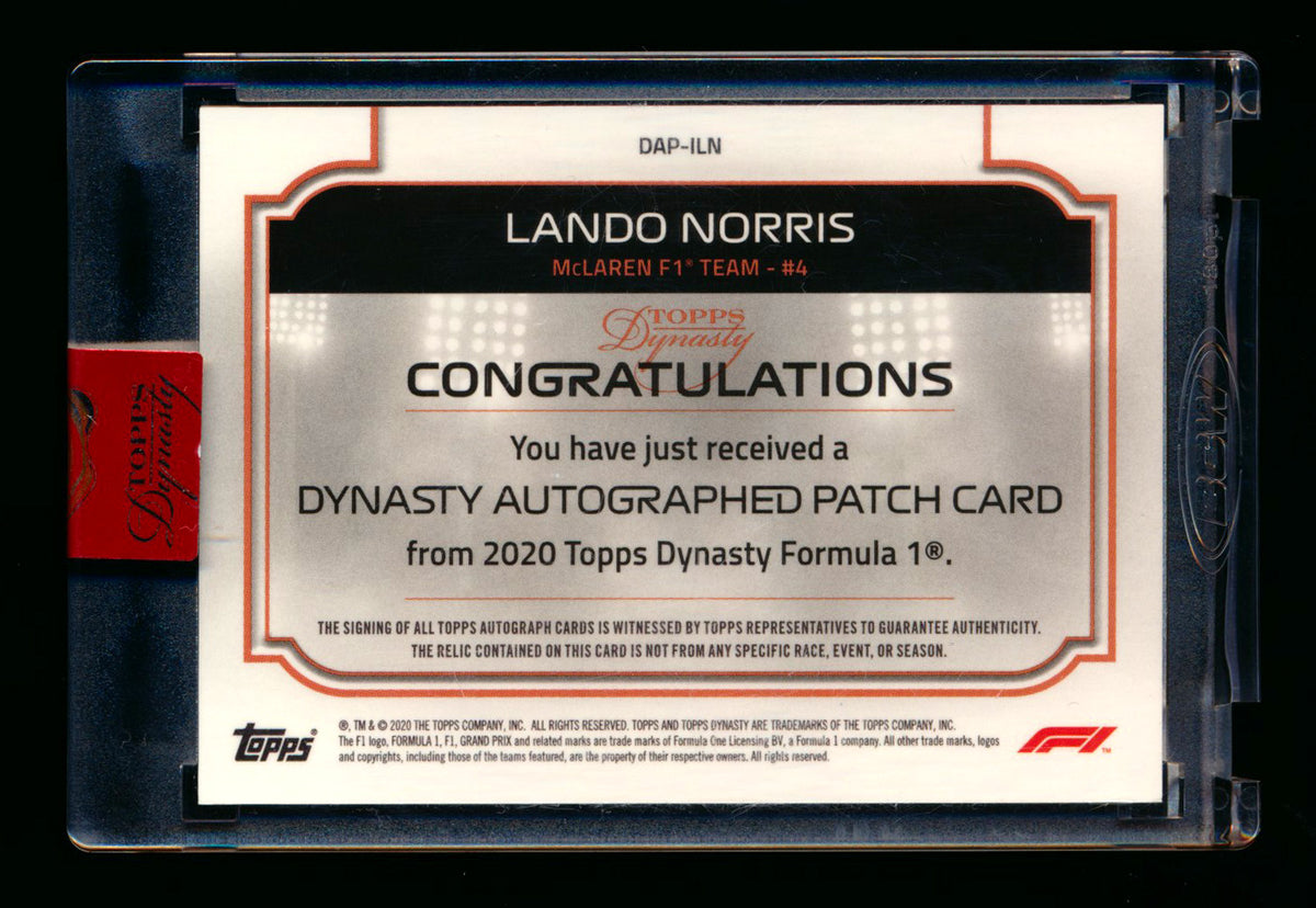 2020 Topps Dynasty F1 #DAP-ILN Lando Norris ROOKIE Patch Autograph #10/10 (Last Number!) ** (SOLD - $3200.00 - 3/1/2025) **