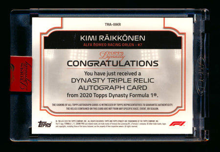 2020 Topps Dynasty F1 #TRA-IIIKR Kimi Raikkonen ROOKIE Triple Patch Autograph #05/10 ** (SOLD eBay - $1,100.00 - 6/21/2025) **