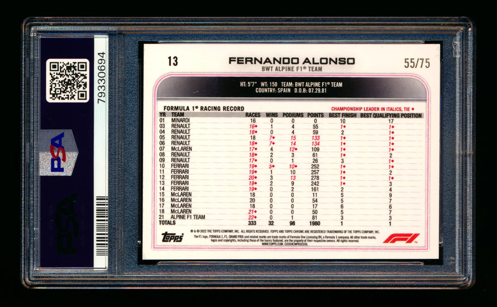 2022 Topps Chrome F1 #13 Fernando Alonso Pink Refractor Portrait #55/75 PSA 10 ** (SOLD eBay - $65.00 - 2/26/2026) **