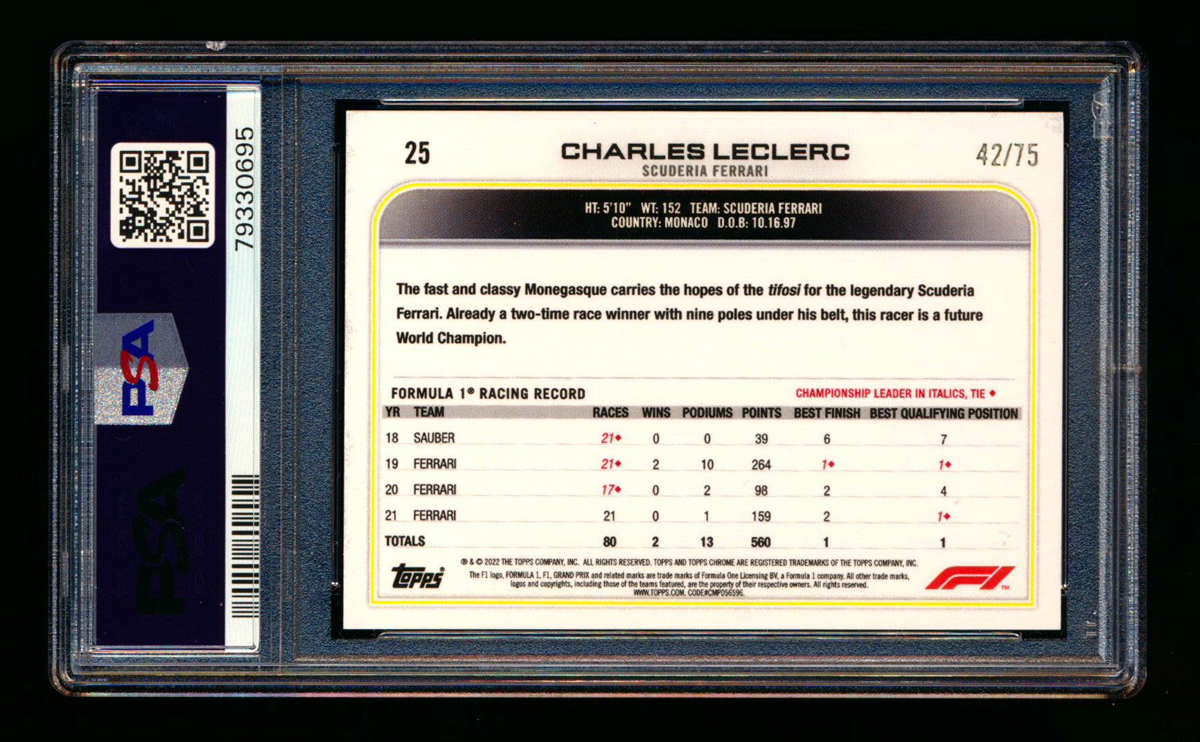 2022 Topps Chrome F1 #25 Charles Leclerc Pink Refractor Portrait #42/75 PSA 10 ** (SOLD eBay - $119.00 - 3/22/2026) **