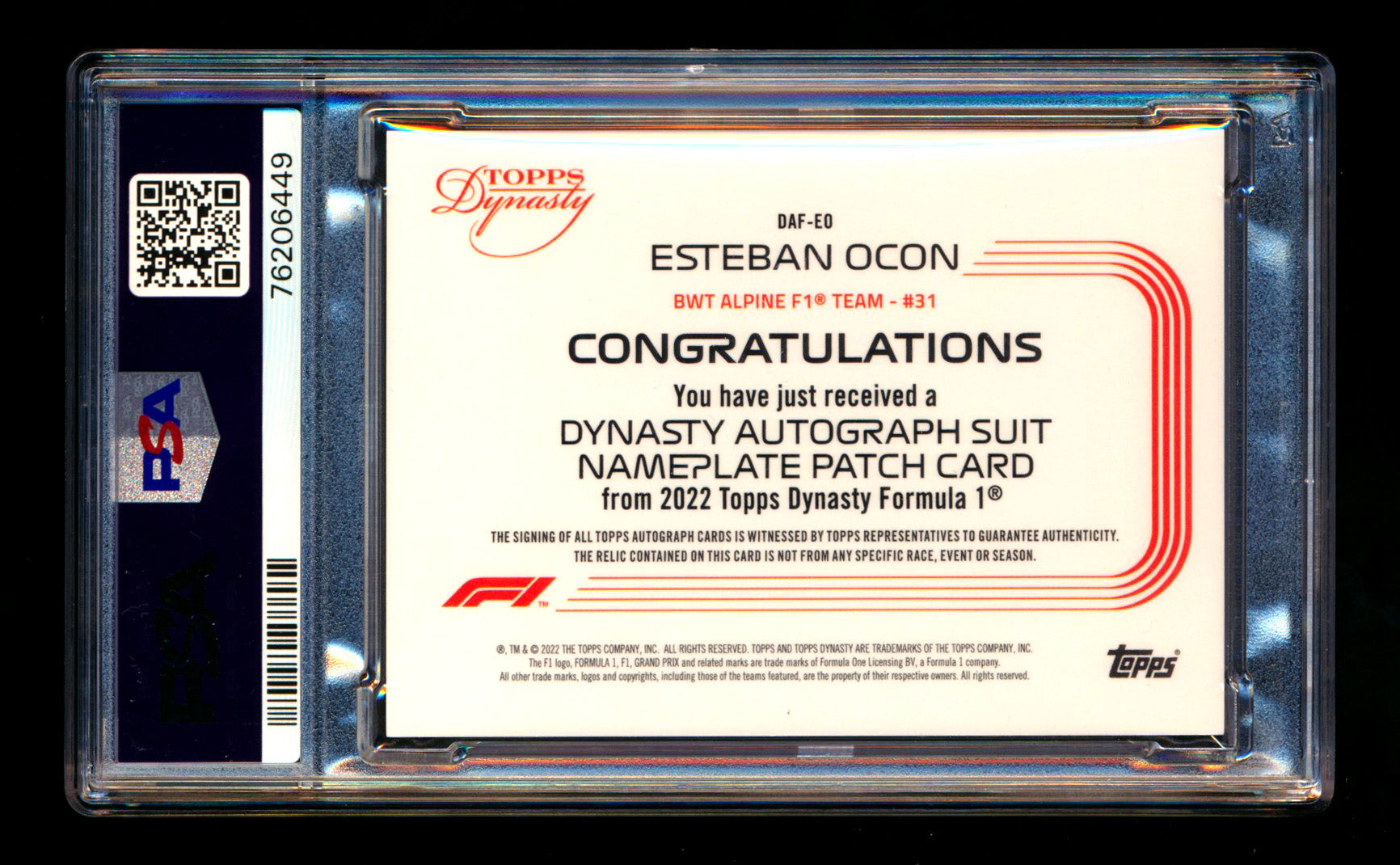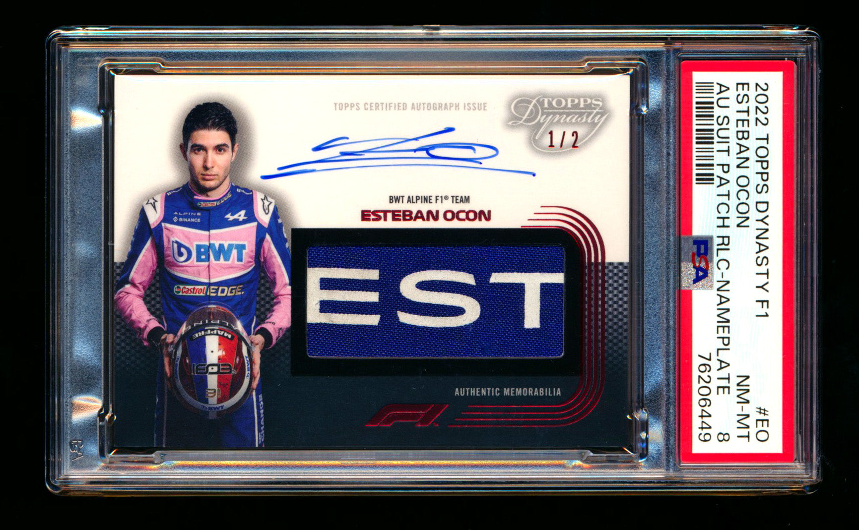 2022 Topps Dynasty F1 #DAF-EO Esteban Ocon Nameplate Patch Autograph #1/2 PSA 8 NM-MT (First #!)