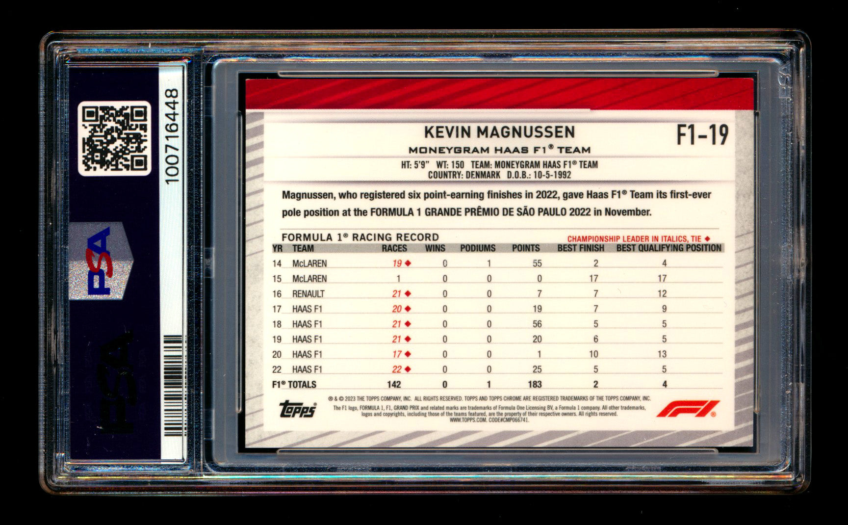 2023 Topps Chrome NSCC F1 #F1-19 Kevin Magnussen Superfractor #1/1 PSA 8 - POP 1!