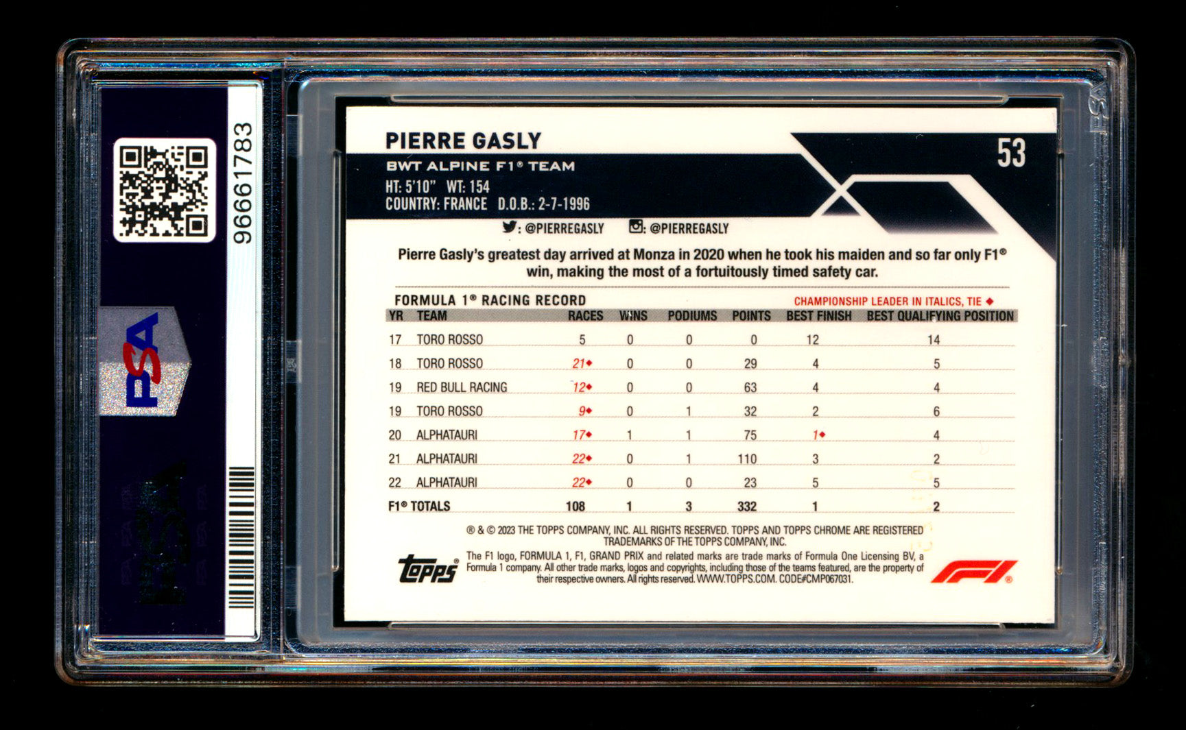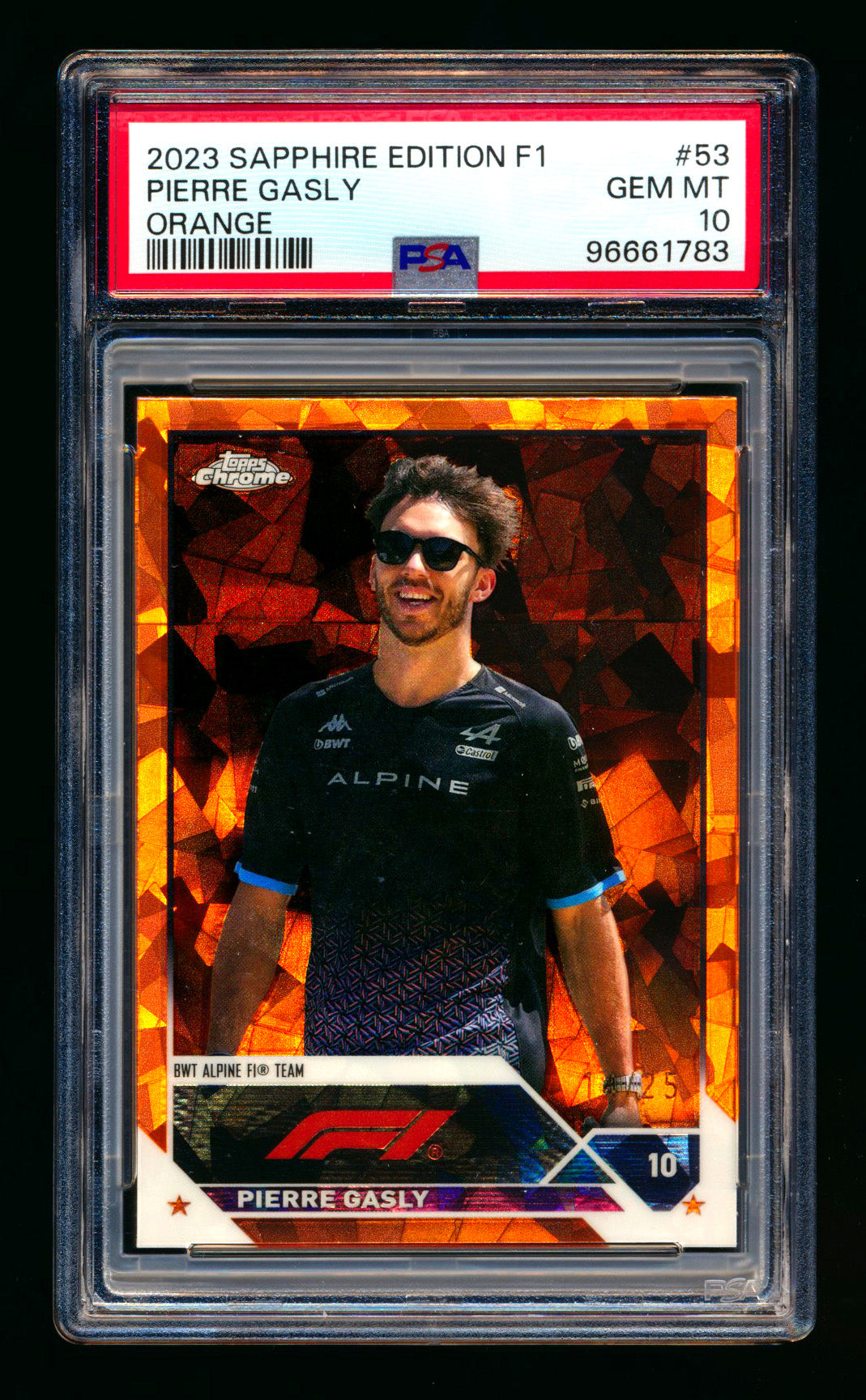 2023 Topps Chrome Sapphire F1 #53 Pierre Gasly Orange Refractor #14/25 PSA 10 - POP 1! ** (SOLD - $50.00 - 7/9/2025) **