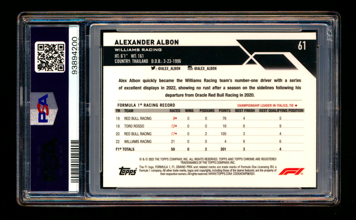 2023 Topps Chrome Sapphire F1 #61 Alexander Albon Gold Refractor Portrait #36/50 PSA 9 ** (SOLD Nationals - $49.00 - 7/31/2025) **