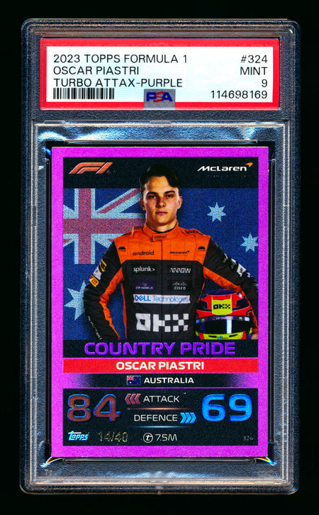 2023 Topps F1 Turbo Attax Country Pride #324 Oscar Piastri RC Purple Foil #14/40 PSA 9