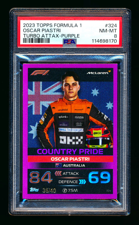 2023 Topps F1 Turbo Attax Country Pride #324 Oscar Piastri RC Purple Foil #36/40 PSA 8