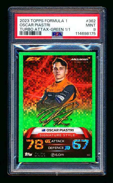 2023 Topps F1 Turbo Attax Signature Style #362 Oscar Piastri RC Green Foil #1/1 PSA 9