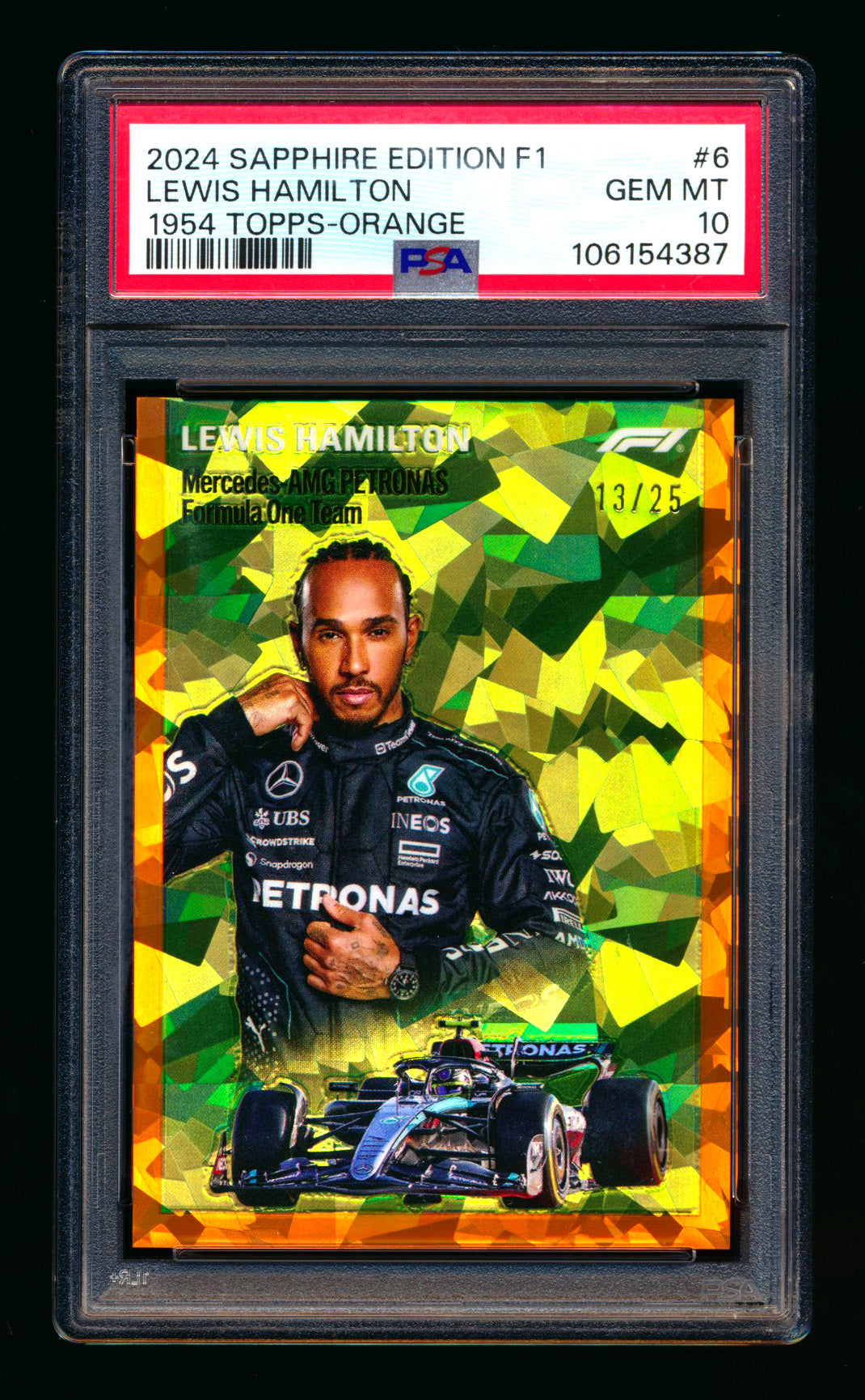 2024 Topps Chrome Sapphire F1 #1954-6 Lewis Hamilton 1954 Orange Refractor #13/25 PSA 10