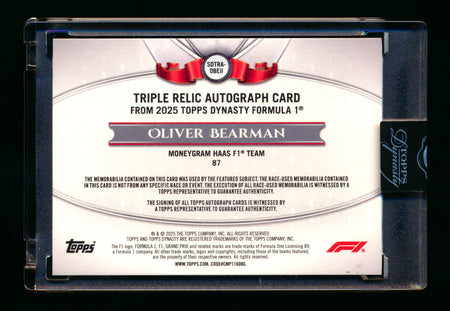 2025 Topps Dynasty F1 #SDTRA-OBEII Oliver Bearman RC ROOKIE Triple Patch Autograph #08/10 ** (SOLD eBay - $1,295.00 - 3/11/2026) **