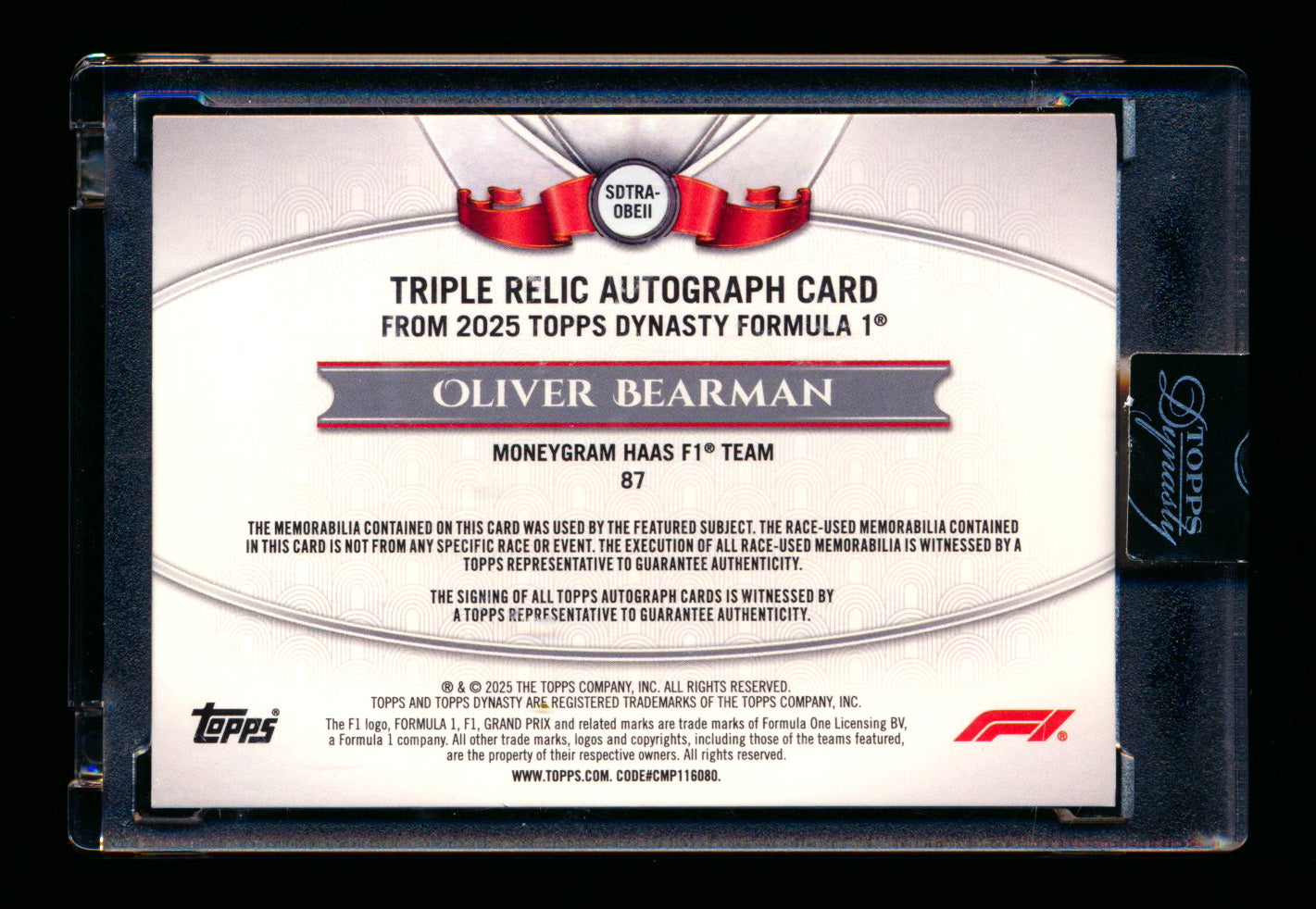 2025 Topps Dynasty F1 #SDTRA-OBEII Oliver Bearman RC ROOKIE Triple Patch Autograph #09/10 ** (SOLD eBay - $1,049.00 - 2/21/2026) **